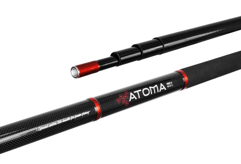 Atoma je vysokou sérií celokarbonových rukojetí k feederovým podběrákovým hlavám. Výrazný, černočervený design v kombinaci s karbonovou strukturou je oku lahodící od první chvíle. Tím to ale nekončí. V momentě, kdy Atomu vezmete do rukou, uvědomíte si její nízkou hmotnost, bezchybné zpracování a vyváženost. Díly do sebe pasují bez nejmenší chybičky. Samotný závit na jejím konci je nádherně vyvázán kontrastní červenou nití. Tento závit je univerzální a kompatibilní s většinou běžně dostupných hlav. Samotná spodní část rukojeti je pokryta protiskluzovou vrstvou shrink tube v dvoubarevném provedení. Atoma je navíc uložena v látkovém transportním pouzdře, což ještě zvyšuje její celkovou hodnotu. Tato rukojeť si podmaní každý jeden rybářský atom ve vašem těle!